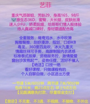 详细介绍:老师是按摩店出来的手法就不多说了,正常进门先洗澡,老师贴心拿拖鞋过来给换,然后就是先洗澡,这个可以提前聊好说帮忙洗鸳鸯没聊大概率自己洗,洗完出来帮你擦干净,然后就服务了,正常去过按摩店应该都知道,先帮你按摩,然后才是服务,漫游胸推毒龙等等一套流程,然后开始口活,最后直接骑上了,过程体验拉满,技术在线,老师是重庆人,热情大方,反正就这价位,总体体验下来还不错